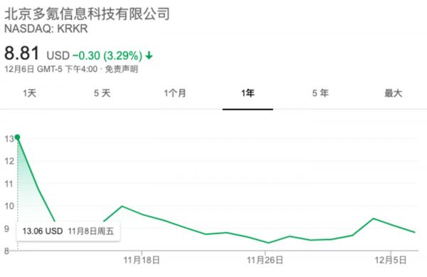 发行价:14.5美元开盘价:12.58美元美东时间12月6日收盘价:8.84美元11月8日,以科技创投媒体起家的36氪在纳斯达克交易所挂牌上市。上市首日,36氪开盘价12.58美元,较发行价14.50美元下跌13.24%。对于上市首日的破发表现,36氪CEO冯大刚表示,“没有预期到会破发”。