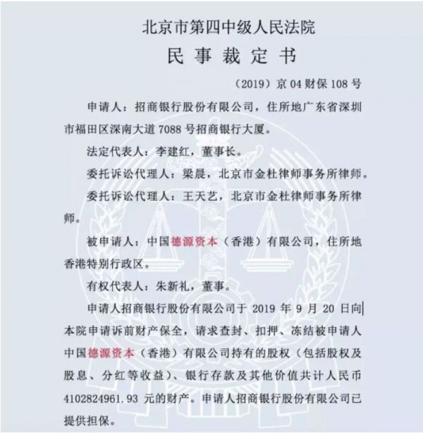 近日,中国裁判文书网披露了一份民事裁定书,招商银行曾于2019年9月20日向法院申请诉前财产保全,请求查封、扣押、冻结德源资本持有的股权、银行存款及其他价值共计人民币41.03亿元财产。