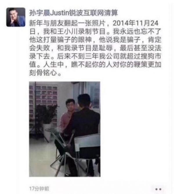 不知是为了让这个午餐热度更高还是得意忘了形,孙宇晨随后就发了条朋友圈,这次被他喷的是搜狗CEO王小川:他说4年半以前跟王小川一起录节目时,被王小川认定是骗子、肯定会失败、一起录节目是耻辱。