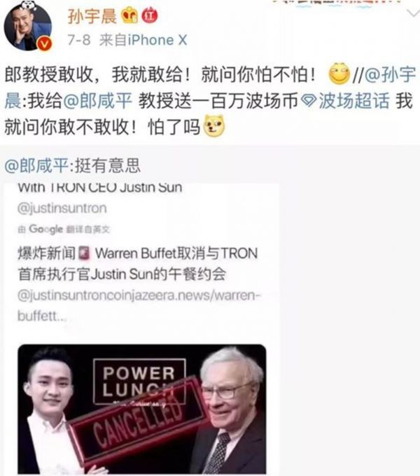 在中标巴菲特午餐事件时,郎咸平曾转发一条说巴菲特取消了跟孙宇晨午餐的微博,孙宇晨迅速回击:要送一百万波场币给郎咸平。