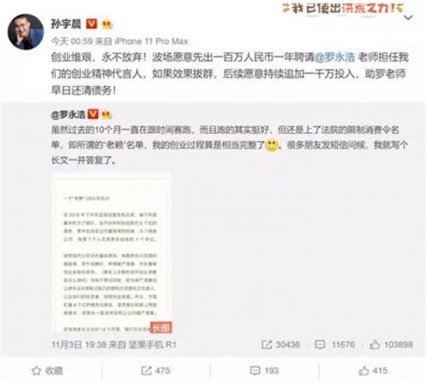 到了11月3日,罗永浩被爆因锤子科技拖欠供应商货款,被法院列为“老赖”,并被限制消费,次日孙宇晨就发微博表示,波场愿意先出一百万人民币聘请罗永浩老师担任创业精神代言人。