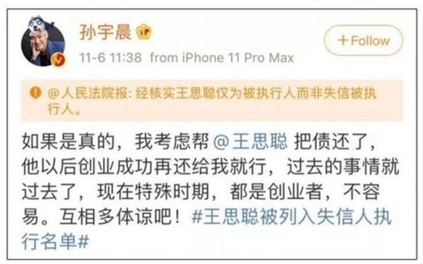 而又过了几天,孙宇晨又表态不计前嫌地准备帮王思聪把债都还了。
