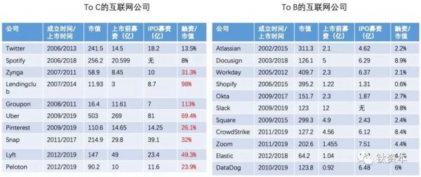 首先,放在同样资本市场里进行对比。上图左边是美国著名的ToC上市公司, 其中Twitter、Uber、Pinterest、Snap、Lyft作为行业的头部公司,市值都在一百亿美金以上,累计的融资金额基本都在30亿美金以上。看融资和市值的比值,除了Twitter和Spotify的稍微低一点之外,其它的基本都在20%以上,最高的甚至超过了100%。而在上图右边的11家ToB公司里,包括今年刚刚上市的DataDog以及今年大红大紫的Slack、Zoom,累计融资金额超过10亿美金的只有三家,而且融资和市值的比值没有一家超过10%,最低的Shopify甚至低到了0.6%。