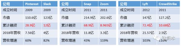 第二组数据。成立于2011年的Snap和Zoom,市值分别是214.9亿美元和202.6亿美元,累计融资金额分别是68.9亿美元和8.965亿美元,它们之间的倍数也相差了7.7倍。