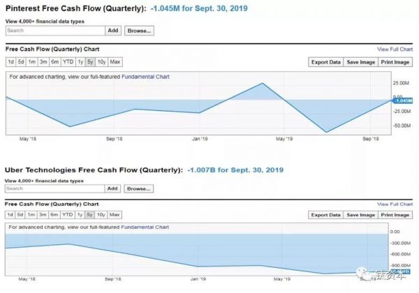 上图是Pinterest和Uber的自由现金流情况。Pinterest绝大部分时间的自由现金流都是负数而且这个规模还在扩大,Uber的情况其实看起来比WeWork更加严重。