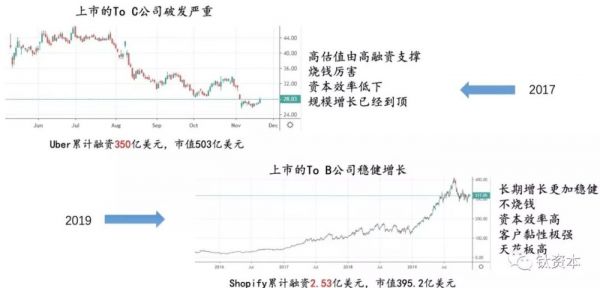 2017年,大家都投向所谓的ToC超级独角兽,表现主要是高估值与高融资支撑,烧钱非常厉害,资本效率低下,增长已经到顶。上图第一张图是Uber上市之后的股价表现,市值503亿美元,但是累计融资是350亿美元。