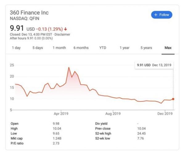 2018年12月14日,360金融在纳斯达克上市,发行价16.5美元,今年4月一度冲高到24.45美元——在一众起起伏伏国内金融科技股中一度算是表现相当不错的。