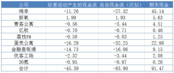 如果看现金流,情况则更加糟糕。除去云集、跟谁学、斗鱼、房多多4家未披露三季度现金流数据的公司之外,其余的9家公司中,仅新氧一家经营活动产生的现金流为正,也只有新氧一家的自由现金流为正。无论是资本快速催熟的瑞幸,还是扮演“亏本二房东”的青客公寓和蛋壳公寓,抑或是有平安系输血加持的金融壹账通,个个都是烧钱大户。