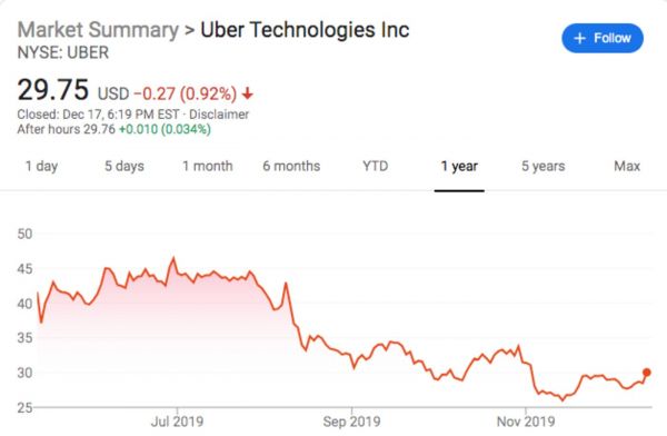 2019年,Uber上市后股价一路下跌,从上市价格45美金已经跌落到29美金。公司的价值也应声跌落到480亿美金, 比2015年还要低不少。