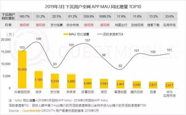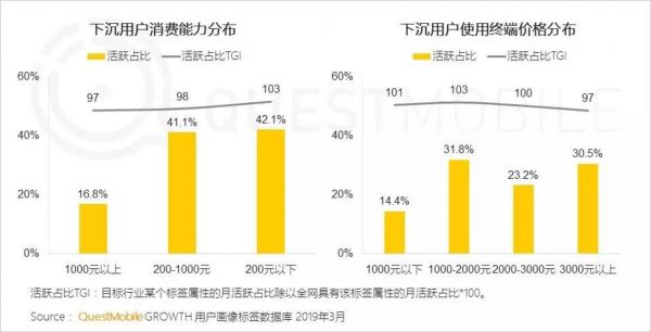 QuestMobile数据显示,下沉市场用户规模超过6亿,18岁以下、46岁以上用户较多,白天刷手机的很多,终端价格普遍低于2000元,对现金奖励、社交推荐、打发时间、实物触感等等相对敏感,自然而然,此前一再发生的增长奇迹,基本也就发生在这几个领域了:社交、娱乐,资讯,以及移动购物等等,相当热门。