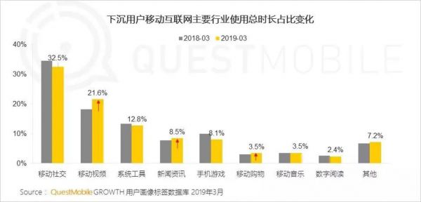 3、下沉用户的注意力分布:社交仍是花费时间最多的领域,但移动视频、新闻资讯、移动购物抢夺了越来越多注意力