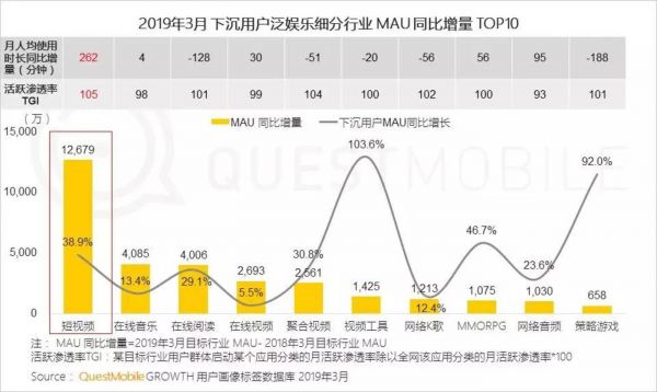 5、泛娱乐行业:满足了下沉用户杀时间需求,短视频成为下沉用户规模、时长增长最为突出的行业,在线音乐、在线阅读等也吸引了大量下沉用户