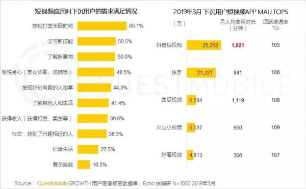 具体到时间占比上看,2019年3月,社交仍是最多的,32.5%,但同比下降了不少;移动视频增长迅猛,时长占比达到21.6%,特别是短视频行业MAU净增了1.27亿,月人均使用时长净增262分钟。不过,坏消息也有,短视频行业竞争加剧,用户平均打开短视频APP3.4个,抖音、快手在下沉市场用户重合用户数增长了251%,存量博弈进入到拼刺刀阶段了。