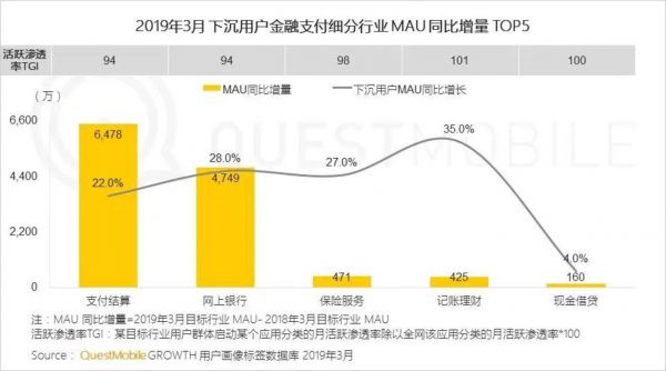 2、社交、娱乐、资讯是下沉用户最常用的应用类型,其中,下沉用户在泛娱乐类(移动视频、移动音乐)、移动购物、金融支付的用户增长尤其明显