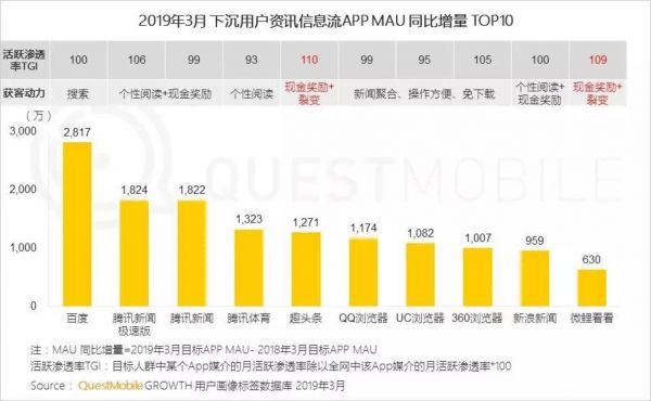 11、在看新闻的时候顺便赚零花钱,对于下沉用户吸引力大,用户增量较大的新闻资讯APP普遍加入了现金奖励措施,趣头条、微鲤看看通过现金奖励和裂变方式,成为下沉市场新闻资讯增长典型