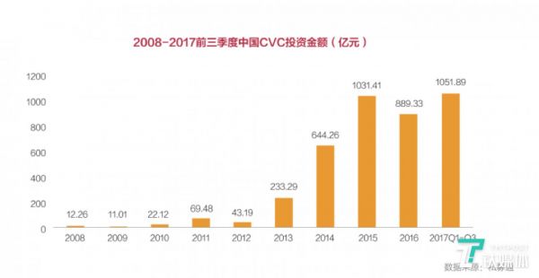 根据CB insights2018年全球VC与CVC投资金额数据可以看出, VC与CVC投资从2013年开始,逐年呈现上升趋势;到2016年遭遇资本“寒流”,导致双向都有所下降;再到2017年两种投资活动均有所增加。虽然风险投资依然占据重要地位,但CVC投资与整体发展趋势一致,且投资金额占全部风险投资交易金额的20%。