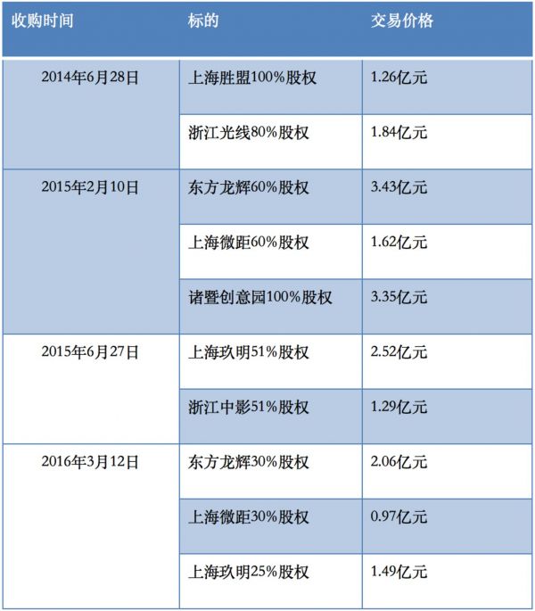 股权质押之余,赵锐勇在2014年至2016年间陆续收购了6家广告公司以及1家影视园,均为现金收购,且标的均与东阳长城签订业绩承诺协议及补偿安排。