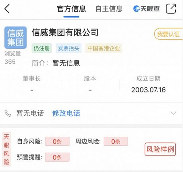界面新闻记者在天眼查搜索香港信威集团发现,并未有成立于2002年5月的公司,搜索结果显示,所有的“香港信威集团”几乎都已宣告解散,仅有一家成立于2003年7月16日的中国香港企业“信威集团有限公司”仍注册,但并无公开信息。