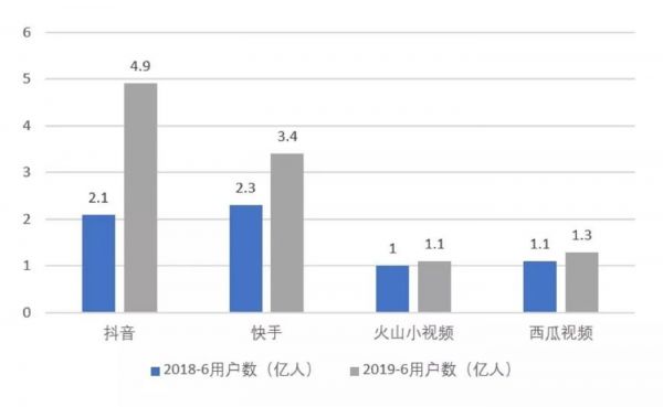 其中以头部短视频APP抖音、快手的活跃用户增势最为明显,分别为133%和47.8%(对比2018M6和2019M6),MAU分别达到4.86和3.41亿。