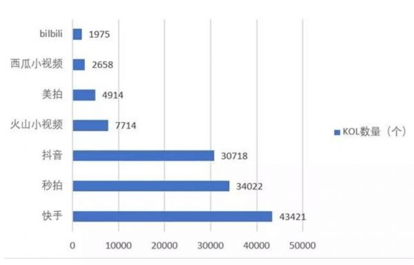 根据卡思数据,各短视频平台的KOL规模目前已超过20万个,其中快手数量最多,达到43421个,抖音、秒拍次之,数量分别为30718和34022个。