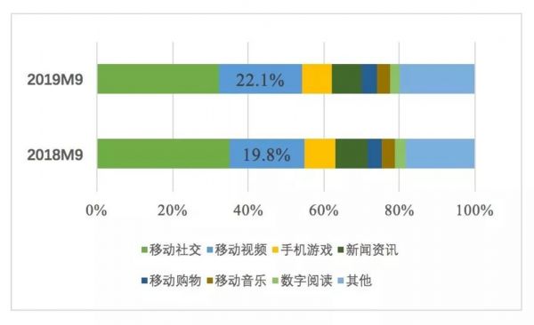 具体从使用时长结构来看,2019年9月移动互联网主要细分行业中时长占比提升的仅有移动视频和移动购物,其中移动视频受短视频驱动时长占比提升幅度最大,同比提升2.3个百分点至22.1%,短视频贡献了互联网时长的主要增量,持续切分用户使用时长。