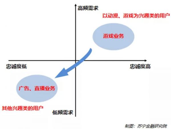 具体来说,以动漫、游戏为兴趣类的用户特点是忠诚度高、对游戏需求频率高,这些用户一般不会在不同游戏之间频繁更换,而且人性的弱点决定了游戏天然属于高频需求;其他兴趣类的用户对运动、摄影、科技等爱好,只是生活休闲方式的一种,需求频度低,不具备成瘾性,且兴趣类视频往往各大视频门户均有覆盖,用户对一般平台并没有很高的忠诚度,但如果用户是被游戏、动漫等游戏吸引或者被B站良好的社区氛围吸引,然后在B站观看其它兴趣类视频,那么用户就会对平台有一定的偏好与依赖。由此可见,B站以忠诚度高、需求频度高的游戏业务为起点,逐渐发展忠诚度低、需求频度低的广告、直播等业务,通过用户群体的扩散、细分来实现业务的扩张。