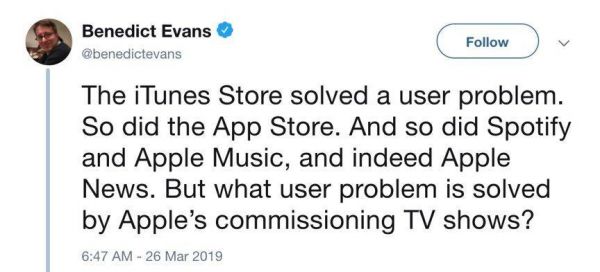 多训练自己思考现有其他企业的用户需求和痛点,借鉴经验,同样有效。比如,不妨跟随风头机构AndreessenHorowitz Fund分析师Benedict Evans一起思考这个问题:Apple寄予厚望的TV Shows解决的痛点是什么?这或许能帮助你进一步理解苹果在下一个十年的进化思路。