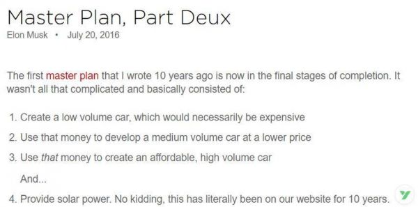 特斯拉内部有一个“10年大师计划”(MasterPlan):