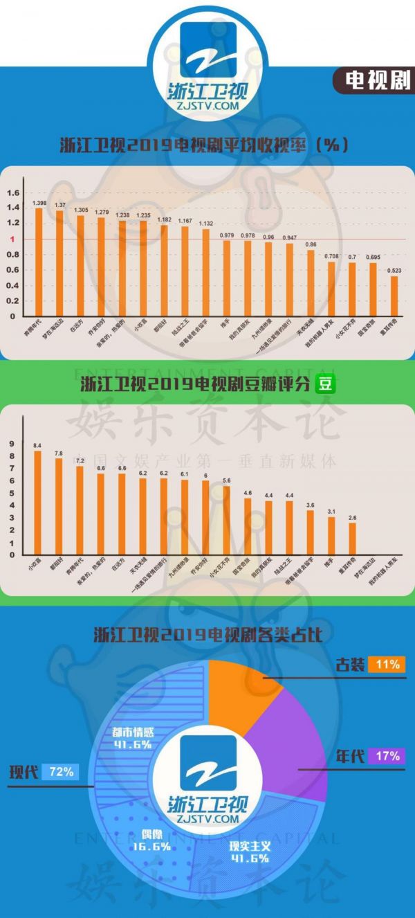 现实主义和都市情感是2019年浙江卫视剧集的顶梁柱。从大类上看,去年浙江卫视现代剧占比达到72%,其中又以都市情感和现实主义为重中之重,两者的占比均为41.6%。相对来说,占比17%的年代剧和11%的古装剧其实在浙江卫视的收视中贡献一般。