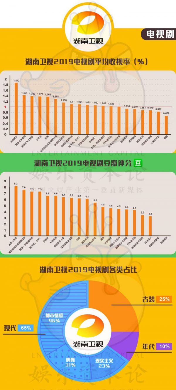 类型上,2019年整体电视剧市场以现代剧为主,但湖南卫视的类型分配上还是给了古装剧很大空间。古装剧的占比为25%,年代戏为10%,现代剧为65%。而在现代剧中,除各家都在专注的都市情感剧,湖南卫视的偶像剧份额较多,占比为31%,现实主义题材占比则为23%。