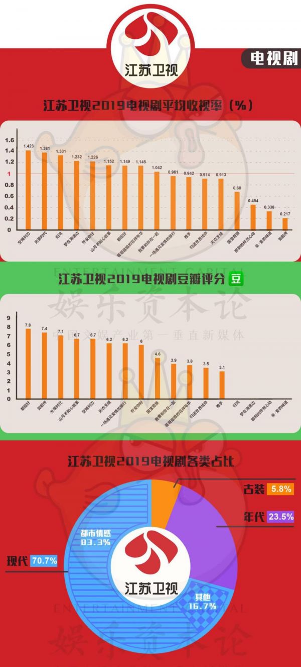 江苏卫视2019年平均收视破1%的剧集同样为9部,收视率最高者为《空降利刃》,《光荣时代》《归鸿》紧随其后。平均收视低于1%剧集为8部,其中周播剧《如懿传》收视垫底,仅为0.217%。《亲·爱的味道》也只有0.338%,在豆瓣尚未开分。