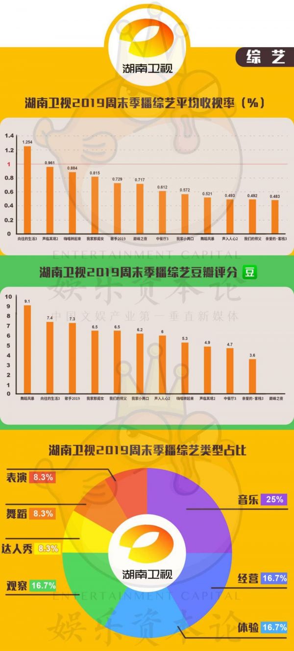 2019年湖南卫视平均收视破1%的综艺只有《向往的生活3》一档。剩下11档节目的平均收视率都不足1%。不管是贡献了年度金句“我不要你觉得,我要我觉得”的《中餐厅3》还是口碑爆棚的《舞蹈风暴》,收视率都十分一般。《亲爱的客栈3》目前平均收视不足0.5%。