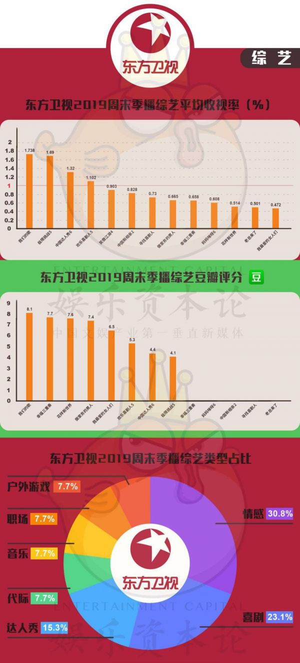 东方卫视2019年的整体综艺表现差强人意,跟播了视频网站的三档节目,包括爱奇艺的观察类节目《做家务的男人》、腾讯视频的《幸福三重奏》以及芒果TV的《我最爱的女人们》。更值得注意的是,三档节目中有两档的收视率超过东方卫视自制综艺。