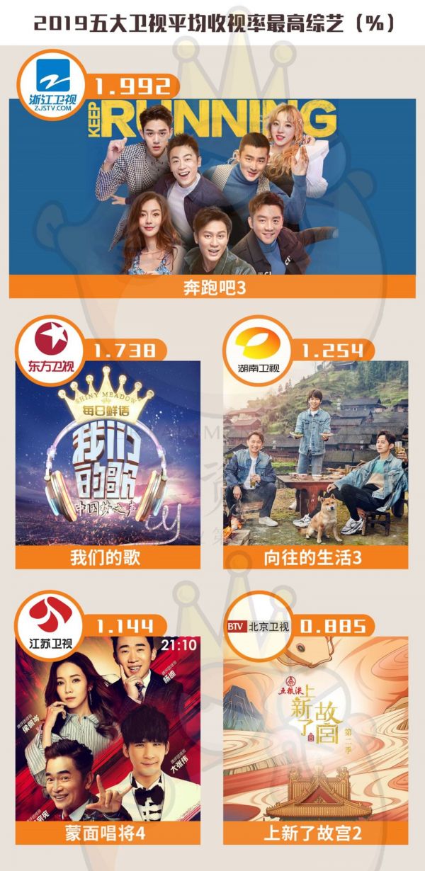 和湖南卫视相比,这几年持续布局综艺项目的浙江卫视算是收获颇丰。2019年浙江卫视周末播出的季播节目为15档,数量居五大卫视之最。且平均收视破1%的节目6档,其中王牌节目《奔跑吧3》失去邓超和鹿晗依然斩获1.992%的收视率,不再火爆的《中国好声音2019》同样有1.707%的平均收视。