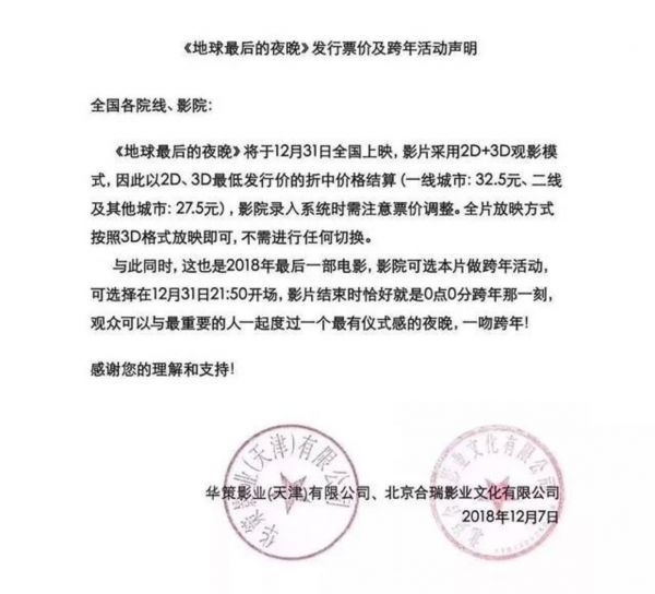 不到一天时间,宣发方正式发文就开始营销“一吻跨年”的概念,一些影院无心插柳提出的9点50开场0点结束的概念也被印上了宣发通知——