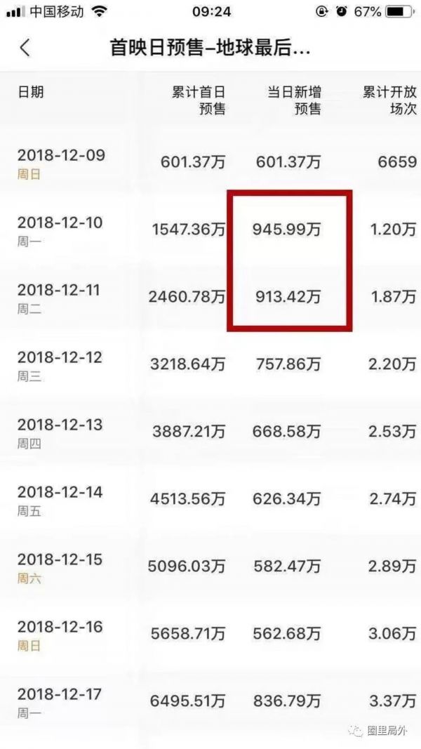 《地球最后的夜晚》在12月9日就开始做预售,在11号下午开始刷爆影院经理的朋友圈,因为当时在三四线城市出现了大量的满场,并且预售直逼2000万。预售2天接近2000万,释放出了什么信息?《捉妖记2》这种20多亿级别票房的预售成绩,也就和这个差不多。