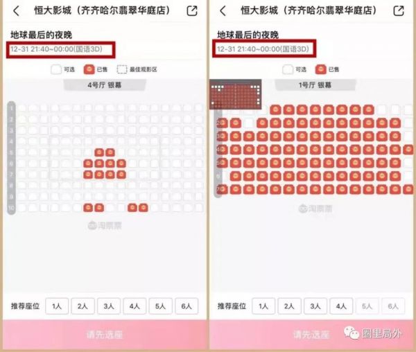 在这些大量满场的三四线城市,出现了很多一家影院同样时间有的厅满场有的厅只卖出零散几个座位的“奇观”。比如说齐齐哈尔的恒大影城翡翠华庭店,主打的“一吻跨年”晚上9点40的两场电影,一场几乎满场,还剩13张票,一场几乎没人买,只卖出去14张票,从概率的角度来讲,这不太合理。