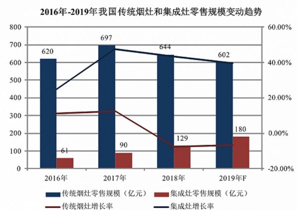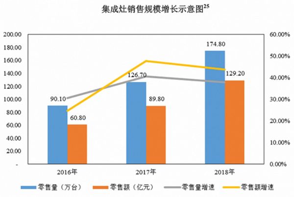 在厨电行业普遍下滑的背景下,集成灶这一细分产品却发展势头迅猛,成为“冬天里的一把火”。2018年,我国集成灶零售规模同比增长43%,达到129亿元。家电咨询机构中怡康预测,2019年集成灶零售规模有望达到180亿元,这意味着40%的增长。