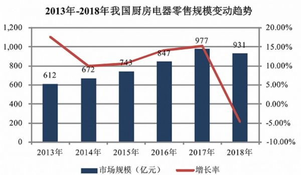 2018年和2019年两年,堪称厨电行业的冬天。2018年,我国厨电零售规模为931亿元,同比下滑5%,2019年上半年延续了这一态势,厨电零售规模同比下滑10.7%。