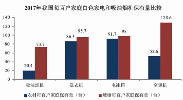 一是,厨电在我国主要家电品类中,渗透率依然是偏低的,2017年我国百户家庭中,油烟机的保有量在农村和城镇分别为20.4台和73.7台,明显低于洗衣机、电冰箱、空调。这固然和居民的生活习惯有关,毕竟一台几十元的排风扇也能起到排烟作用,如果这些排风扇能升级成油烟机,当然意味着很大的市场潜力。