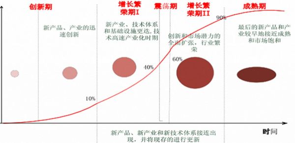 新产品渗透的S型曲线大致上分为三个阶段:创新期、成长期及成熟期。新技术、新产品在渗透率达到10%之前称为创新期,渗透率介乎10%至90%之间为成长期,渗透率90%之后称为成熟期。渗透率在超越10%之前会有很多的反复,新技术、新产品甚至因此被淘汰。而一旦突破10%的阻力位,会快速达到50%的水平,美国汽车渗透率由10%升至50%,只用了7年,这一时期是新技术、新产品的黄金时间。