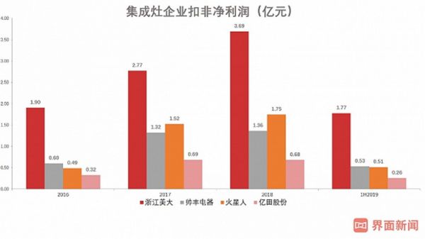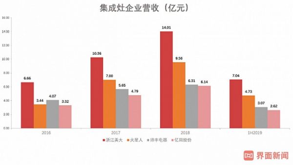 而根据传统烟灶企业老板电器(002508.SZ)和华帝股份(002035.SZ)的披露,2019年上半年,这两家的集成灶营收分别仅为8070万元和218万元。