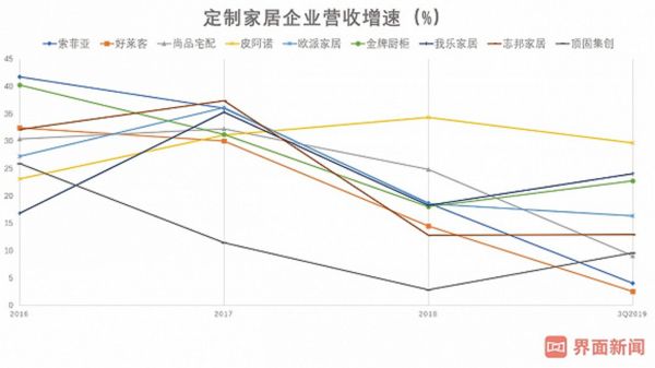 从定制家居企业营收增速来看,2017年正是最高点。选取9家A股定制家居,其2016年至2019年三季度营收增长的中位数分别为30.4%、32.2%、18.3%和12.9%。其中,索菲亚营收增速从2016年的42%,一路下降到2019年的个位数增长。