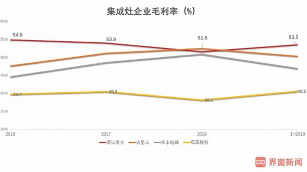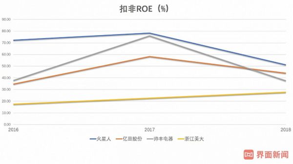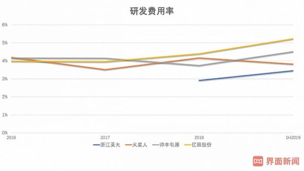 从毛利率看,除2018年外,浙江美大的毛利率都处于领先水平,火星人略高于帅丰,亿田则明显落后。