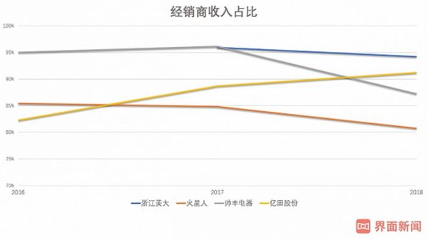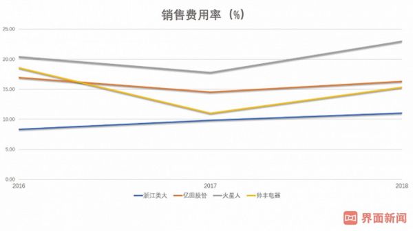 结合经销商收入占比,更能反映各公司产品的溢价能力。一般来说,经销商比例高会使毛利率偏低。截至2018年底,经销商比例最高的是浙江美大,而其毛利率反而较高,说明浙江美大有明显超越其他公司的溢价能力,而火星人比较重视在线直营销售,经销商收入比例最低,可以解释其较高的毛利率。