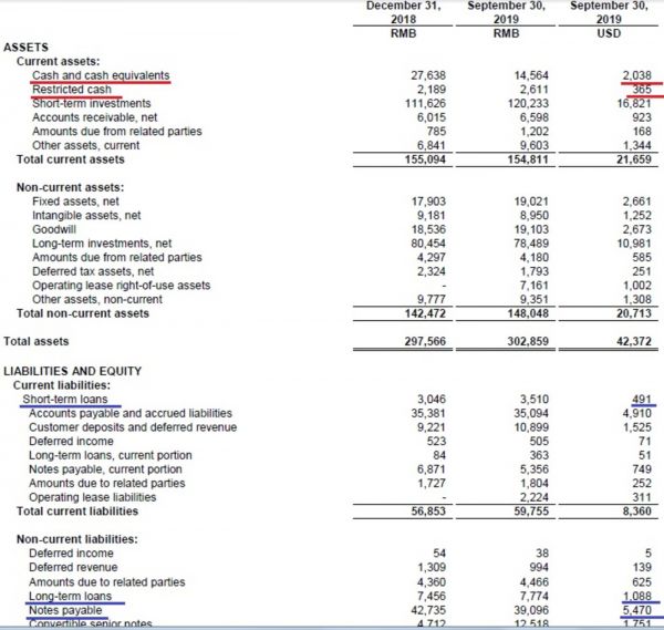 我们来看上图中百度的最新资产负债表3Q19(单位:百万)。截至2019.9.30其现金及等价物+限制性现金(专款专用)是20.38+3.65=24亿美元,这里不对Q4进行预测,暂且选用Q3数据;