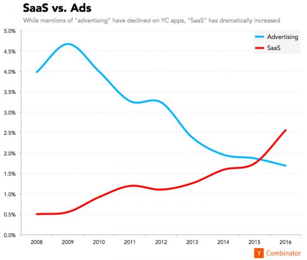 可以看到,自 2008-2016 年,“SaaS”的使用频率增加了 400%,而“广告”减少了 60%以上。