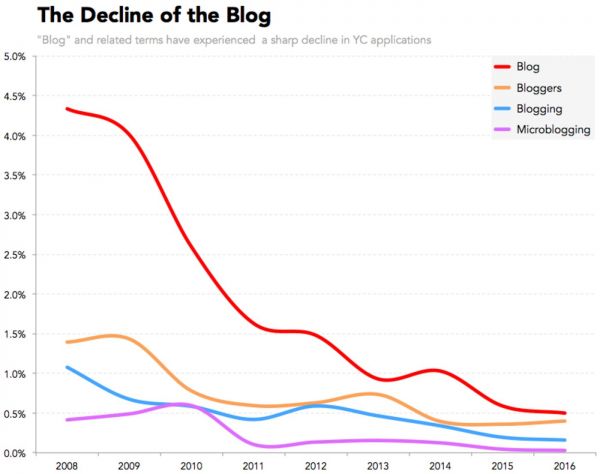 第四个问题和博客有关,曾经许多申请 YC 的创业项目都和 Blog 有关,但这个趋势早已不再流行。