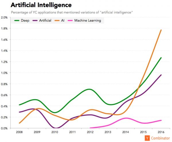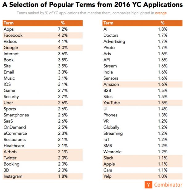 在这份研究中,YC 另外还专门统计了一些关键词,发现 2016 年 Facebook 和谷歌(4%)仍然是被引用次数最多的公司。而 Uber、Airbnb 以及 Slack 正在迅速崛起。