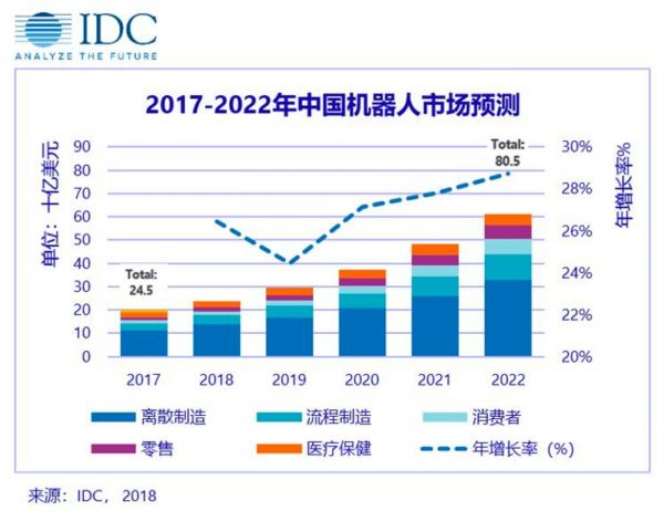 IDC 发布的 2018-2022 年中国机器人市场预测数据